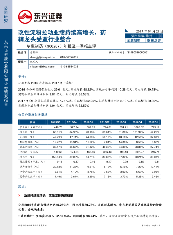 尔康制药2016年业绩实现超高增长,主要原因是改性淀粉的持续放量。公司依托淀粉胶囊为核心,打造业绩增长发动机,并通过淀粉硬胶囊的差异化及终端优势,有望在制剂终端定价上获得更大空间。