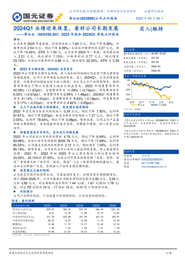 本报告分析了寿仙谷(603896)2023年报和2024年一季报,指出公司2023年业绩受到宏观经济影响有所放缓,但2024年一季度已迎来复苏,归母净利润增速显著。报告强调了公司主力产品盈利能力的稳定以及销售渠道的多样化发展,并看好公司未来长期稳健增长的潜力。