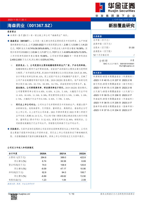 本报告对新股海森药业(001367.SZ)进行了覆盖研究,核心观点如下: