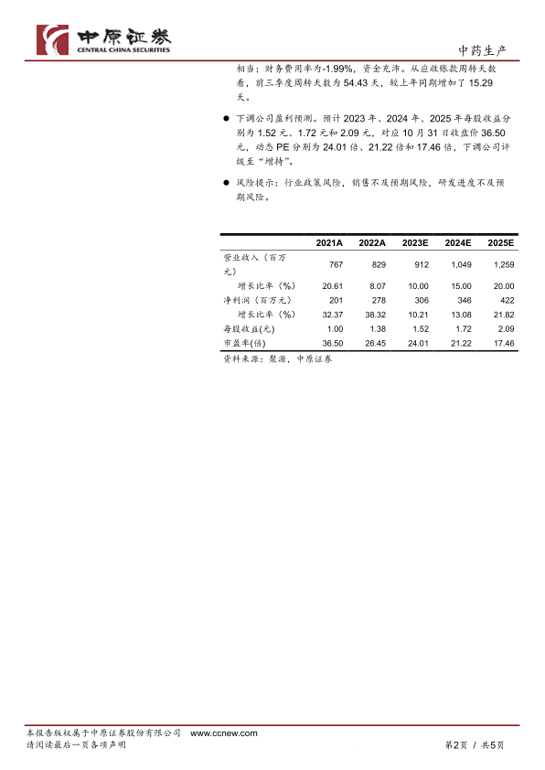 下调公司盈利预测。预计2023年、2024年、2025年每股收益分别为1.52元、1.72元和2.09元,对应10月31日收盘价36.50元,动态PE分别为24.01倍、21.22倍和17.46倍,下调公司评级至“增持”。