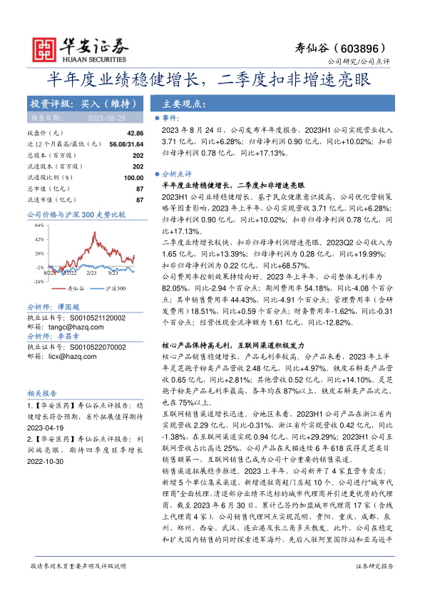 本报告分析了寿仙谷(603896)2023年半年度业绩,并维持“买入”评级。核心观点如下: