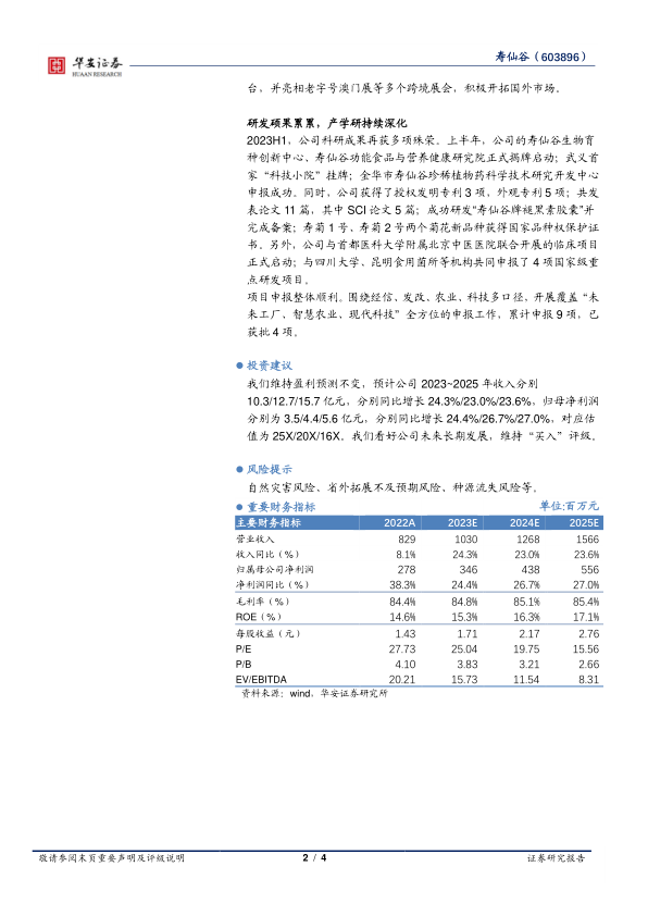 寿仙谷2023年半年度业绩表现稳健,二季度扣非归母净利润增速亮眼。公司核心产品保持高毛利,互联网渠道销售增长迅速。同时,公司持续投入研发,并积极进行项目申报。维持对公司未来长期发展的看好,维持“买入”评级。需关注自然灾害风险、省外拓展不及预期风险、种源流失风险等。
