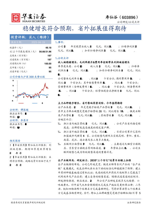 全产业链持续布局。公司已形成灵芝、铁皮石斛等系列产品的“全产业链”发展模式。优良品种从源头为下游的标准化种植提供了保障;建立中药材种植基地通过有机认证;先进的现代中药饮片炮制等工艺提高了利用效率及产品品质;建立自身的销售渠道,增强流通渠道的控制力。研发持续推进,新品迭出,2022年公司产品研发呈现多元化趋势。六味地黄丸、补中益气丸和金锁固精丸完成生产地址变更和再注册;二冬汤、桃红四物汤两个经典名方完成毒理研究,芍药甘草汤等七个经典名方完成基准物质研究。另外,寿仙上品牌破壁灵芝孢子粉颗粒/粉/片等5个保健食品完成备案;寿仙谷牌破壁灵芝孢子粉颗粒取得再注册批件,其余系列产品开发进展顺利。