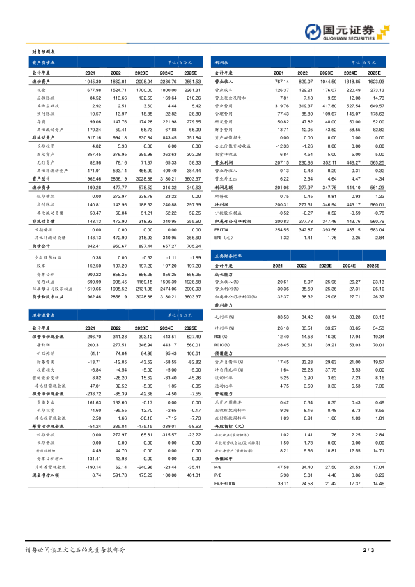 预计公司2023-2025年营业收入分别为10.45亿元、13.19亿元和16.24亿元,归母净利润分别为3.47亿元、4.44亿元和5.61亿元,对应EPS分别为1.76元/股、2.25元/股和2.84元/股,维持“买入”评级。