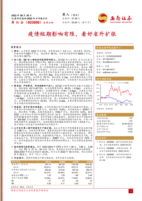 公司正积极推进省外市场扩张战略,通过加盟商模式加速渠道下沉,预计2022年将新增30家城市代理商,为省外收入的快速提升奠定基础。同时,公司计划公开发行可转债募集资金用于健康产业园的产能扩建和研发检测中心建设,旨在形成年产20吨保健食品片剂、胶囊剂的生产能力,以满足省外扩张带来的市场需求,并培育新的利润增长点。这些战略举措,结合公司在研发上的持续投入,预示着寿仙谷未来业绩的持续增长潜力,分析师给予“买入”评级,并设定了55.6元的目标价。