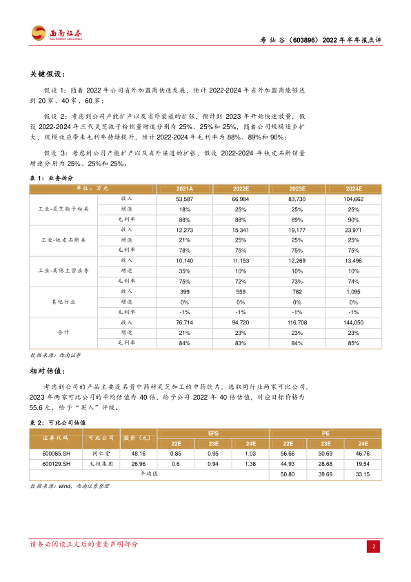 寿仙谷在2022年上半年展现出强劲的盈利能力和明确的增长战略。尽管第二季度受到疫情短期影响,公司通过积极的线上营销和有效的费用管控,实现了归母净利润近五成的显著增长。核心产品灵芝孢子粉和铁皮石斛的收入和毛利率均表现出色,产品结构持续优化。展望未来,公司加速推进省外加盟商网络建设,并计划通过公开发行可转债扩建产能,以支持其全国市场扩张战略,这些举措有望为公司带来新的利润增长点。综合考虑其稳健的财务表现、清晰的增长路径以及产能扩张带来的潜力,分析师维持“买入”评级,并设定了具有吸引力的目标价,表明对公司未来发展的信心。同时,投资者需关注原材料价格波动及省外扩张进度等潜在风险。