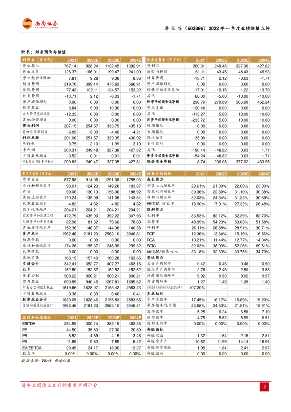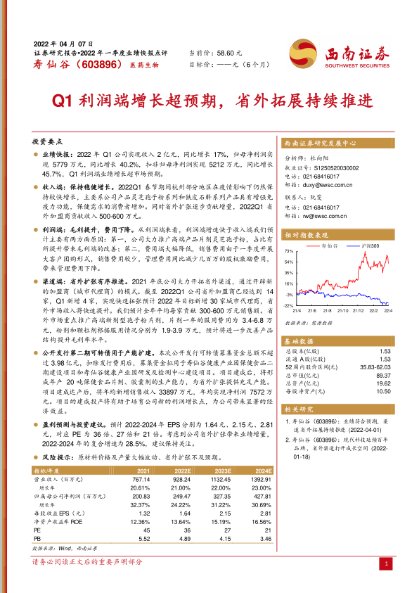 寿仙谷在2022年第一季度展现出强劲的业绩增长势头,特别是利润端表现超预期,这主要得益于公司在产品结构优化(推广高端片剂)和费用控制方面的有效策略。展望未来,公司正通过积极的省外渠道扩张战略,结合公开发行可转债进行产能扩建,以保障市场供应并培育新的利润增长点。财务预测显示,公司未来几年营收和净利润将持续保持稳健增长,盈利能力和财务健康状况均有望进一步提升。尽管存在原材料价格波动和省外扩张不及预期的风险,但整体来看,公司具备良好的发展潜力和投资价值。