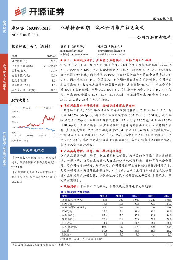 寿仙谷2021年财报展现出强劲的增长势头,营业收入和归母净利润均实现两位数增长,盈利能力显著提升。这得益于公司在销售渠道上的积极创新,特别是互联网零售的有效补充和省外经销模式改革的初步成功。公司在种源、培育和加工环节形成的核心闭环优势,为其产品构建了坚实的市场护城河,并为未来的全国市场拓展奠定了基础。开源证券基于对公司核心优势和渠道拓展潜力的分析,维持“买入”评级,并对未来三年业绩持乐观预测。同时,报告也提示了省外推广和中药政策可能带来的风险。总体而言,寿仙谷展现出稳健的财务表现和明确的增长路径,具备较高的投资价值。