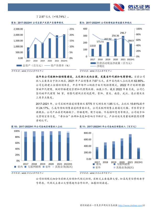 公司立足浙江走向全国,发展省外代理和电商营销。公司自2017年上市以来,营业收入和净利润每年保持正增长。目前公司收入主要来自于浙江地区,公司支持建立全国经销体系,开启市场中心的孢子粉片剂招商模式,2022年计划新增20家城市代理商,此外公司互联网渠道已成为传统销售渠道的重要补充。随着公司业务向省外拓展,营销推广力度加大,有望提高市占率。此外公司铁皮石斛、西红花等产品收入保持稳健增长态势,新产品研究有序开展,有望丰富产品集群,扩大品牌影响力。