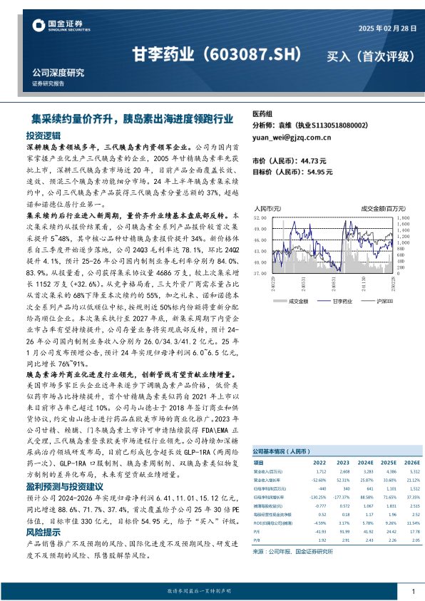 集采续约后行业进入新周期,量价齐升业绩基本盘底部反转。本次集采续约从报价结果看,公司胰岛素全系列产品报价较首次集采提升5~48%,其中核心品种甘精胰岛素报价提升34%。新价格体系自三季度开始逐步落地,公司24Q3毛利率达78.1%,环比24Q2提升4.1%,预计25-26年公司国内制剂业务毛利率分别为84.0%、83.9%。从报量看,公司获得集采协议量4686万支,较上次集采增长1152万支(+32.6%)。从竞争格局看,三大外资厂商需求量占比从首次集采的68%下降至本次续约的55%,加之礼来、诺和诺德本次全系列产品均以低顺位中标,按规则近50%标内份额将重新分配给高顺位企业。本次集采执行至2027年底,新集采周期下内资企业市占率有望持续提升,公司存量业务将实现底部反转,预计24-26年公司国内制剂业务收入分别为26.0/34.3/41.2亿元。25年1月公司发布预增公告,预计24年实现归母净利润6.0~6.5亿元,同比增长76%~91%。