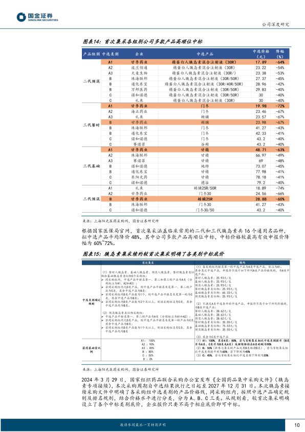 深耕胰岛素领域多年,三代胰岛素内资领军企业。公司为国内首家掌握产业化生产三代胰岛素的企业,2005年甘精胰岛素率先获批上市,深耕三代胰岛素市场近20年,目前产品全面覆盖长效、速效、预混三个胰岛素功能细分市场。24年上半年胰岛素集采续约中,公司三代胰岛素产品获得三代胰岛素分量总额的37%,超越诺和诺德位居行业第一。