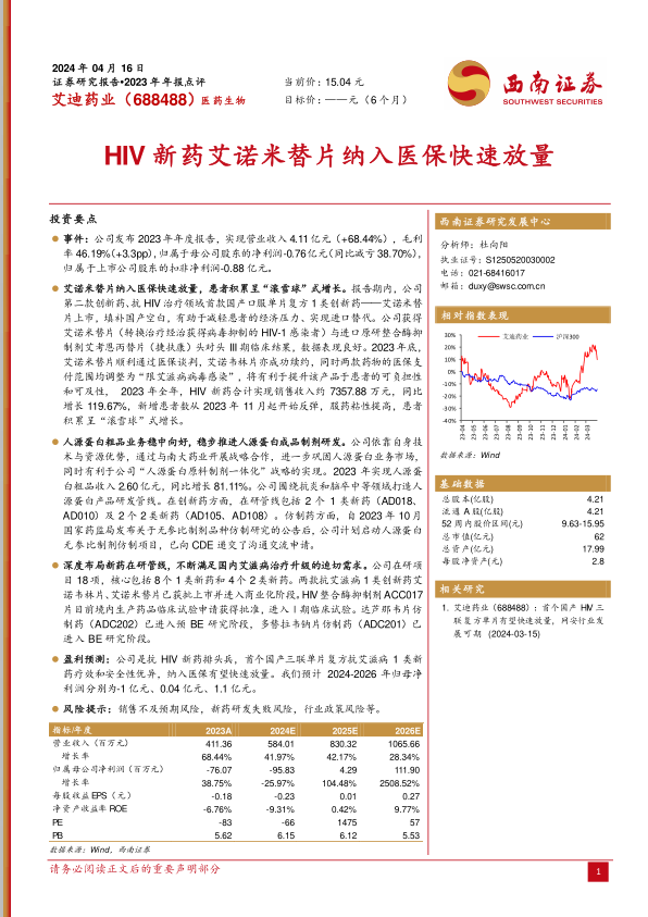 艾迪药业2023年营业收入实现显著增长,主要得益于其核心HIV创新药艾诺米替片在成功纳入医保后的快速放量,以及人源蛋白粗品业务的稳健发展。公司通过优化产品结构和市场策略,有效提升了整体毛利率,并显著减少了亏损。