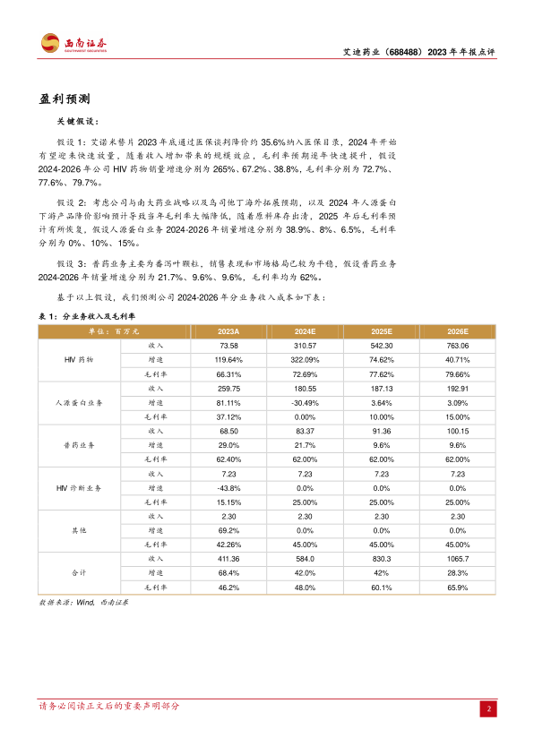 西南证券预计艾迪药业作为抗HIV新药排头兵,其首个国产三联单片复方抗艾滋病1类新药疗效和安全性优异,纳入医保有望快速放量。预计公司2024-2026年归母净利润分别为-1亿元、0.04亿元和1.1亿元,表明公司有望在2025年实现盈利转正。总营业收入预计将从2023年的4.11亿元增长至2026年的10.66亿元,复合年增长率显著。同时,总毛利率预计将从2023年的46.2%提升至2026年的65.9%。