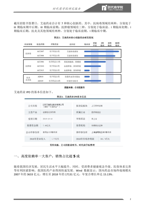 中国药品市场规模在有利因素推动下快速发展,从2007年的3633亿元增长至2018年的17131亿元,年复合增长率达15.13%。然而,艾迪药业的营业收入规模却呈现大幅波动态势。招股书显示,2016年至2019年,公司营收分别为2.58亿元、1.36亿元、2.77亿元和3.45亿元,其中2017年营收同比大幅下滑47.15%。这种剧烈波动与公司对大客户的高度依赖密切相关。