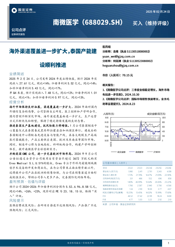 推进泰国生产基地建设,抗风险能力将增强。1月公司泰国制造中心奠基仪式在泰国春武里府邦拉蒙县洛加纳园区举行。建成后的泰国制造中心将配备先进设备与智能产线,具备大规模生产高端医疗器械能力,产品主要供应美国、欧洲及东南亚等国际市场。同时,制造中心将与当地高校、科研机构合作,构建产学研创新体系,提升南微医学全球创新实力。