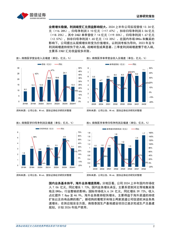 业绩增长稳健,利润端受汇兑损益影响较大。2024上半年公司实现营收13.34亿元(+16.28%),归母净利润3.10亿元(+17.47%),扣非归母净利润3.06亿元(+18.25%)。其中24Q2单季营收7.14亿元(+19.55%),归母净利润1.67亿元(+2.57%),扣非归母净利润1.65亿元(+3.35%)。在国内市场DRGs和集采的影响下,公司提出从规模增长转变为价值增长,以利润考核为导向,2023年至今利润端增速持续快于收入端,战略转型成果显著。二季度利润端增速慢于收入端,主要系23Q2汇兑收益较多所致。