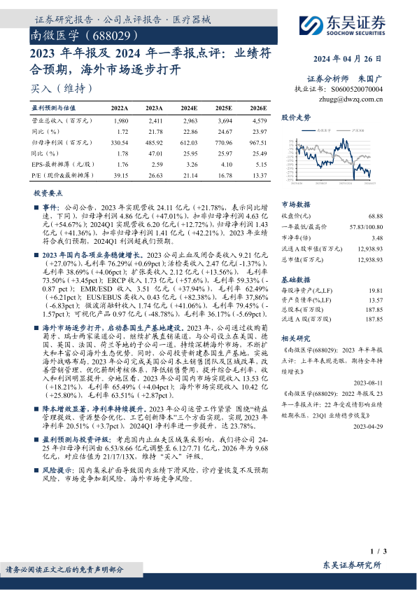 本报告分析了南微医学(688029)2023年年报及2024年一季报,指出公司业绩符合预期,尤其是一季度利润超出预期。报告强调了公司国内业务的稳健增长和海外市场的逐步打开,以及降本增效带来的净利率提升。