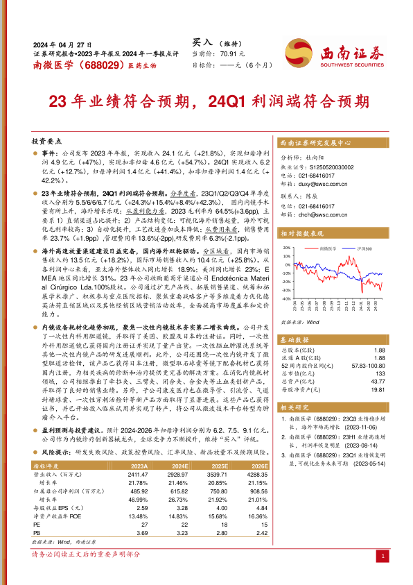 基于公司强劲的业绩表现、全球化布局和创新驱动战略,分析师对南微医学的未来盈利能力持乐观态度。预计2024年至2026年,公司归母净利润将分别达到6.2亿元、7.5亿元和9.1亿元。鉴于公司作为内镜诊疗创新器械龙头,全球竞争力不断提升,分析师维持“买入”评级。