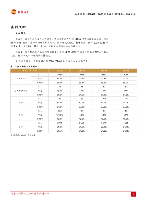基于这些假设,公司总收入预计在2024-2026年分别达到29.29亿元、35.40亿元和42.88亿元,增速分别为21.46%、20.85%和21.15%。自主产品是主要的收入贡献者,其毛利率维持在65%左右。整体毛利率预计在64%左右,保持较高水平。