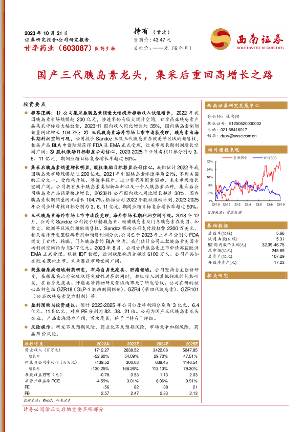 盈利预测与投资建议:预计2023-2025年公司归母净利润分别为3亿元、6.4亿元、11.5亿元,对应PE分别为82、38、21倍。公司为国产三代胰岛素龙头企业,产品出海潜力广阔,首次覆盖,给予“持有”评级。