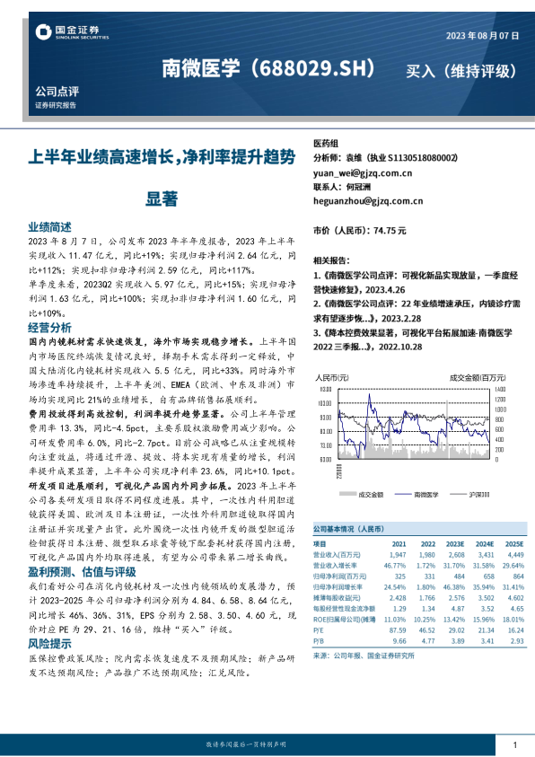 本报告分析了南微医学2023年半年度报告,指出公司在营收和净利润方面均实现了显著增长,这得益于国内市场的强劲复苏和海外市场的稳步拓展。公司通过高效的费用控制和战略调整,实现了利润率的显著提升。此外,公司在可视化产品和镜下配套耗材的研发和注册方面取得了重要进展,为未来的增长奠定了基础。维持“买入”评级,但同时也提示了医保政策、市场需求、研发和推广以及汇兑等方面的风险。