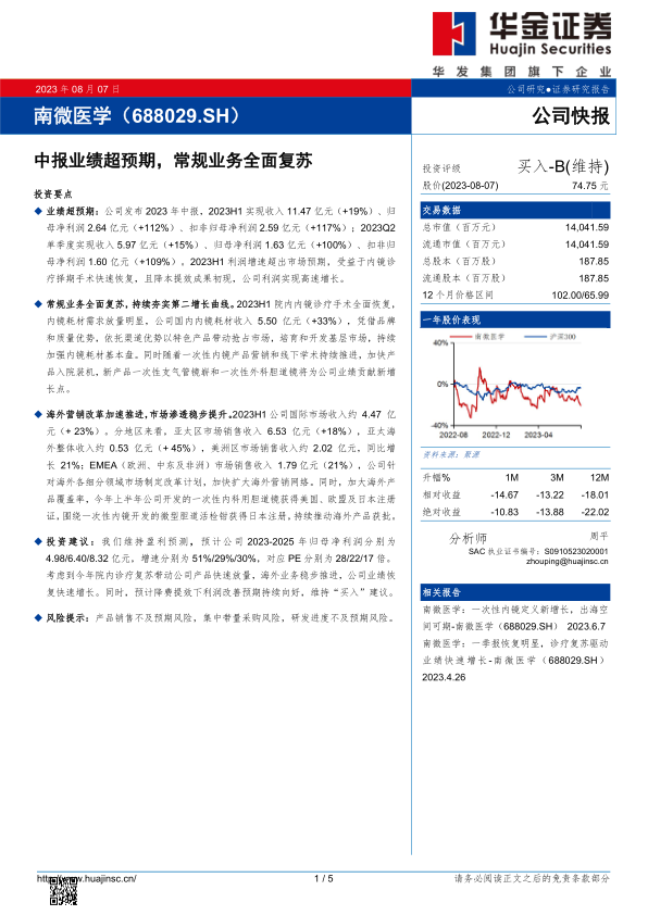 南微医学2023年中报业绩超预期,受益于常规业务的全面复苏和海外市场的加速拓展。公司通过降本提效,利润改善预期向好。维持“买入”评级,但需关注产品销售、集采和研发进度等风险。