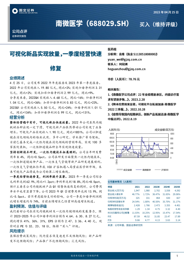 本报告对南微医学2022年年报及2023年一季报进行了深入分析。公司整体经营稳中有升,可视化新品快速放量,成为业绩增长的主要驱动力。公司坚持创新技术研发,一次性内镜技术拓展顺利,有望成为公司新的增长点。一季度经营快速修复,利润率提升显著。维持“买入”评级,但需关注医保控费、需求恢复、研发推广以及汇率波动等风险。