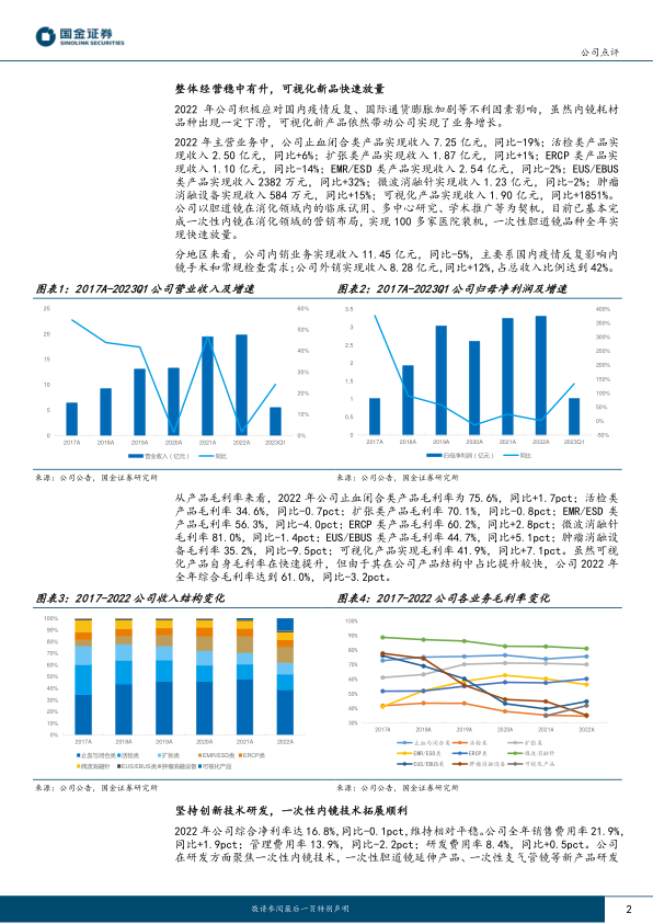我们看好公司在消化内镜耗材及一次性内镜领域的发展潜力,预计2023-2025年公司归母净利润分别为4.64、6.30、8.27亿元,同比增长41%、36%、31%,EPS分别为2.47、3.36、4.40元,现价对应PE为32、23、18倍,维持“买入”评级。风险提示医保控费政策风险;院内需求恢复速度不及预期风险;新产品研发不达预期风险;产品推广不达预期风险;汇兑风险。