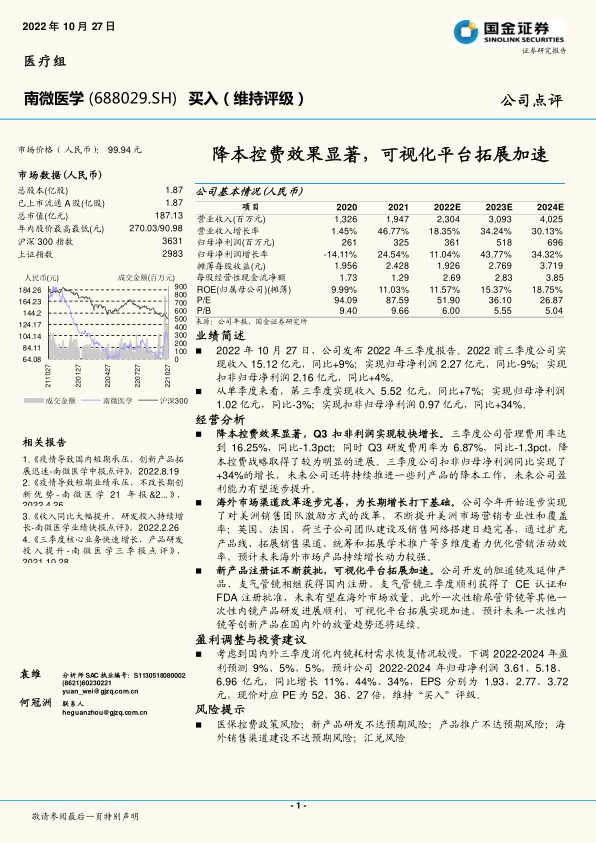 本报告分析了南微医学2022年三季度报告,指出公司通过降本控费实现了盈利能力的提升,海外市场渠道改革逐步完善,新产品注册证不断获批,可视化平台拓展加速。报告同时下调了公司未来几年的盈利预测,但维持了“买入”评级,并提示了医保控费、研发、市场推广等多方面的风险。总体来看,南微医学在国内外市场均具有较强的增长潜力,但同时也面临一定的挑战。
