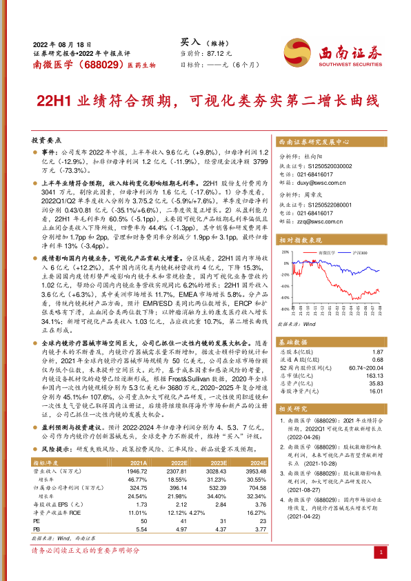 南微医学2022年上半年业绩在疫情挑战下仍符合预期,收入结构持续优化,可视化产品线作为第二增长曲线展现出强劲的增长潜力。公司在全球内镜诊疗器械市场中拥有巨大的发展空间,并已成功抓住一次性内镜的行业发展机遇,通过持续的研发投入和市场拓展,不断提升其全球竞争力。尽管短期内毛利率受到产品结构调整的影响,但公司在费用控制和现金流管理方面表现良好,未来业绩增长可期。西南证券维持“买入”评级,并预计公司未来三年归母净利润将保持稳健增长,巩固其在内镜诊疗创新器械领域的龙头地位。