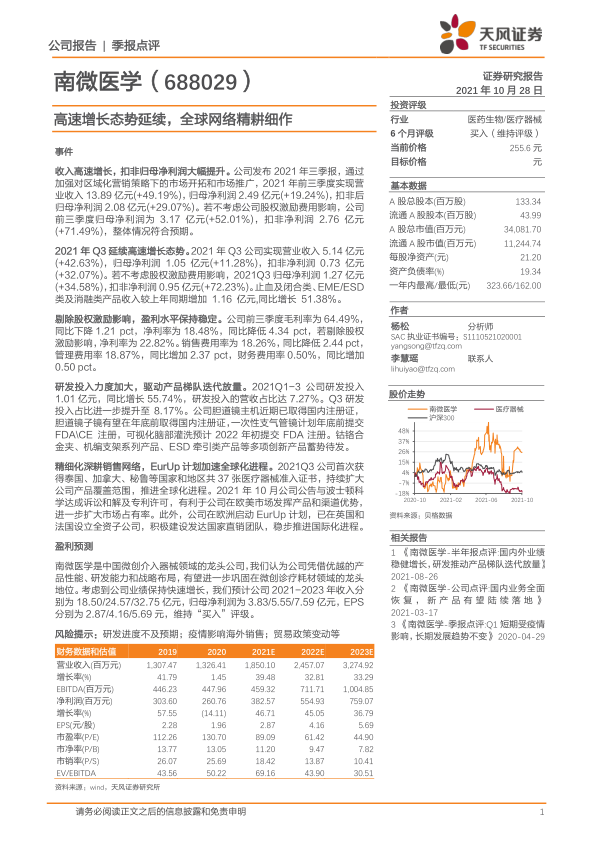 本报告对南微医学2021年三季报进行了全面分析,指出公司营收和利润保持高速增长,盈利能力稳定。公司加大研发投入,驱动产品创新,并积极推进全球化战略,与波士顿科学达成和解,有望进一步扩大市场份额。维持“买入”评级,但需关注研发进度、疫情影响和贸易政策变动等风险。