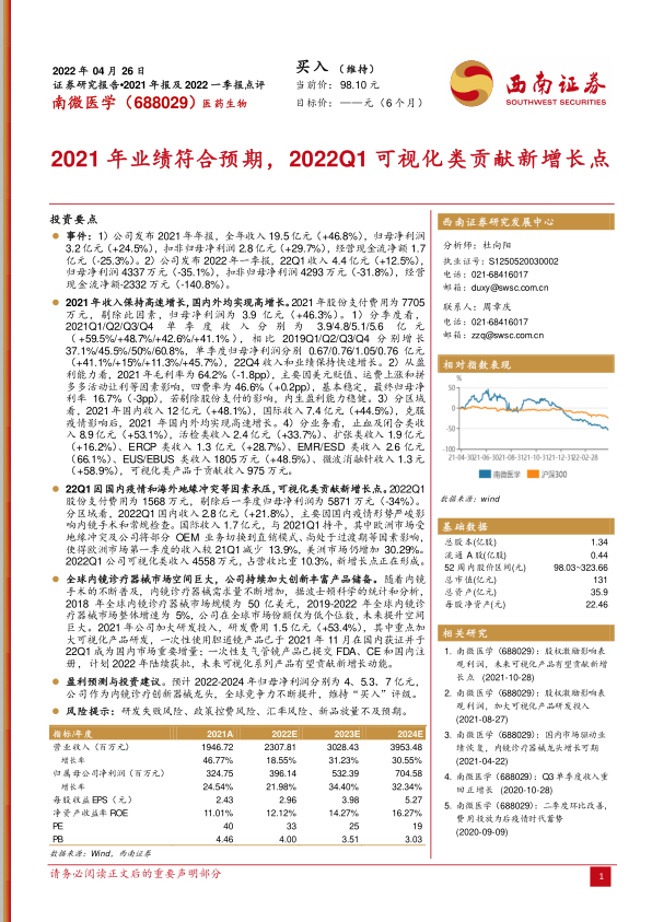 本报告分析了南微医学(688029)2021年年报和2022年一季报,并维持“买入”评级。