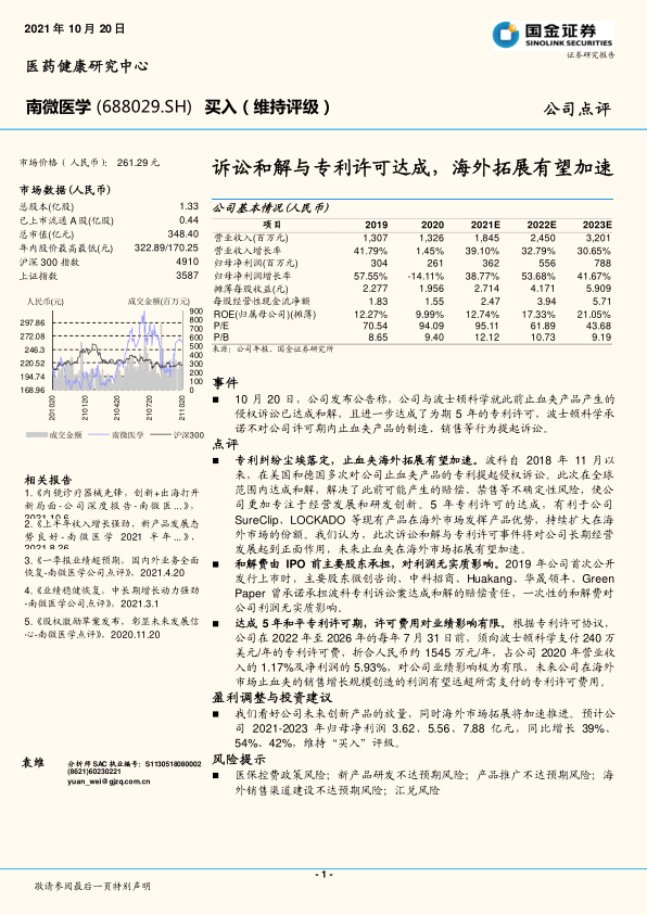 报告看好公司未来创新产品的放量,以及海外市场拓展的加速推进,预计公司2021-2023年归母净利润将保持快速增长。维持“买入”评级,并提示了医保控费、新产品研发、产品推广、海外销售渠道建设以及汇兑风险。