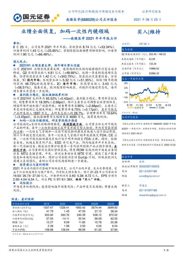 本报告对南微医学2021年半年报进行了全面分析,公司业绩显著反弹,海外市场增长强劲,盈利能力稳定,并在一次性内镜领域加大投入,研发管线稳步推进。维持“买入”评级,并看好公司未来的发展前景。