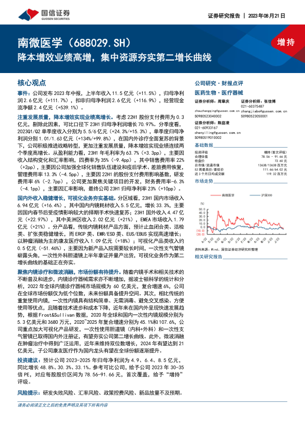 南微医学在2023年上半年取得了显著的业绩增长,营业收入和归母净利润均实现大幅提升,这主要得益于公司积极的降本增效策略、国内外诊疗市场的全面复苏以及对发展质量的持续关注。公司在传统内镜诊疗耗材领域保持稳健增长的同时,正积极布局并夯实以一次性内镜为代表的可视化业务,该业务有望成为公司未来新的增长引擎,抓住全球一次性内镜市场高速发展的历史机遇。尽管公司面临高值医用耗材集采带来的价格压力和日益激烈的市场竞争,但通过深耕国际市场、多元化创新以及提升产品竞争力,公司有望有效抵御潜在风险并扩大市场份额。基于对公司未来业绩的乐观预测和综合估值分析,报告给予南微医学“增持”评级,但同时强调了估值、盈利预测、技术、经营、行业政策及宏观经济等多重潜在风险,提示投资者需审慎考量。