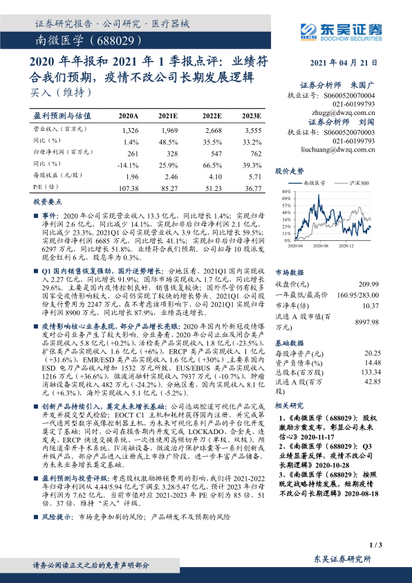 南微医学在2020年疫情影响下仍保持了营收增长,并在2021年第一季度实现了强劲的业绩反弹,尤其国内市场表现突出。公司通过持续的创新产品研发和市场拓展,不断丰富产品线,为未来增长奠定了坚实基础。尽管短期盈利预测因股权激励费用有所调整,但分析师对公司长期发展逻辑保持乐观,并维持“买入”评级,认为公司具备应对市场挑战和实现持续增长的潜力。