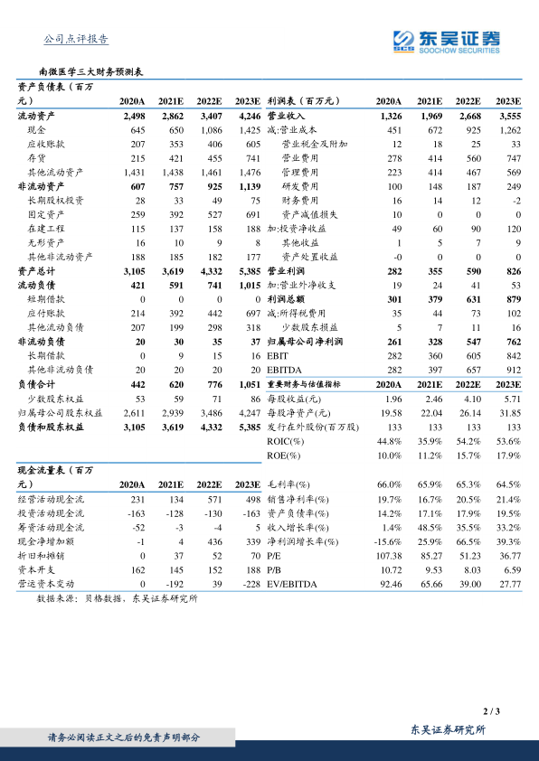 考虑到股权激励摊销费用的影响,分析师将南微医学2021-2022年归母净利润预测分别下调至3.28亿元和5.47亿元,并预计2023年归母净利润为7.62亿元。当前市值对应2021-2023年PE分别为85倍、51倍、37倍。基于公司稳健的业绩表现和持续的创新能力,分析师维持“买入”评级。