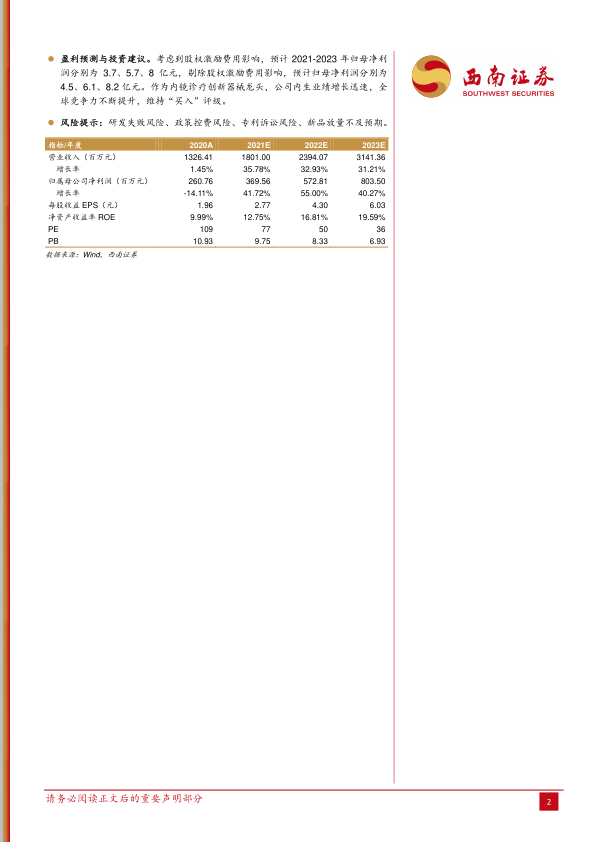 盈利预测与投资建议。考虑到股权激励费用影响,预计2021-2023年归母净利润分别为3.7、5.7、8亿元,剔除股权激励费用影响,预计归母净利润分别为4.5、6.1、8.2亿元。作为内镜诊疗创新器械龙头,公司内生业绩增长迅速,全球竞争力不断提升,维持“买入”评级。