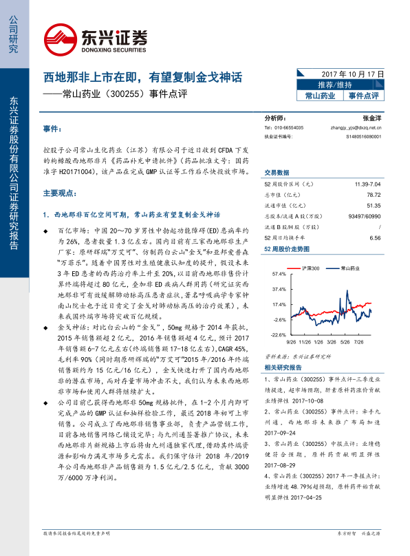 常山药业凭借西地那非上市在即的机遇,有望复制金戈神话,同时受益于肝素原料药涨价、制剂出口业务拓展以及创新药和医疗服务领域的布局,公司未来1-3年看点颇多,业绩增长潜力巨大。