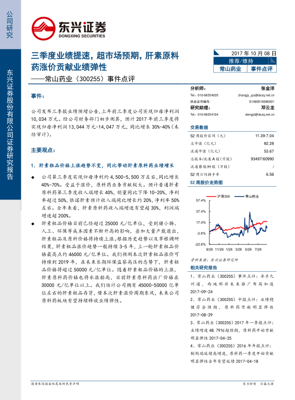 常山药业三季度业绩超预期,主要得益于肝素原料药涨价带来的业绩弹性。公司在肝素原料药业务上具有优势,受益于肝素粗品价格上涨的趋势。