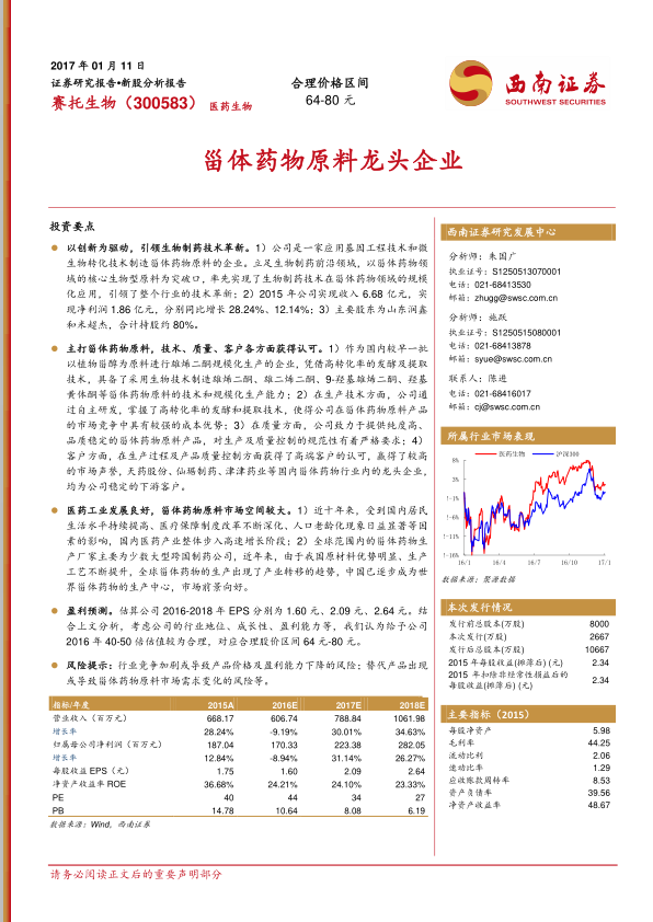 基于对公司业务的假设(羟基黄体酮销量平稳增长20%,价格稳定;雄烯二酮2016年受竞争影响销量下滑50%但2017年恢复性增长;毛利率及各项费用保持相对平稳),报告预计公司2016-2018年EPS分别为1.60元、2.09元、2.64元。