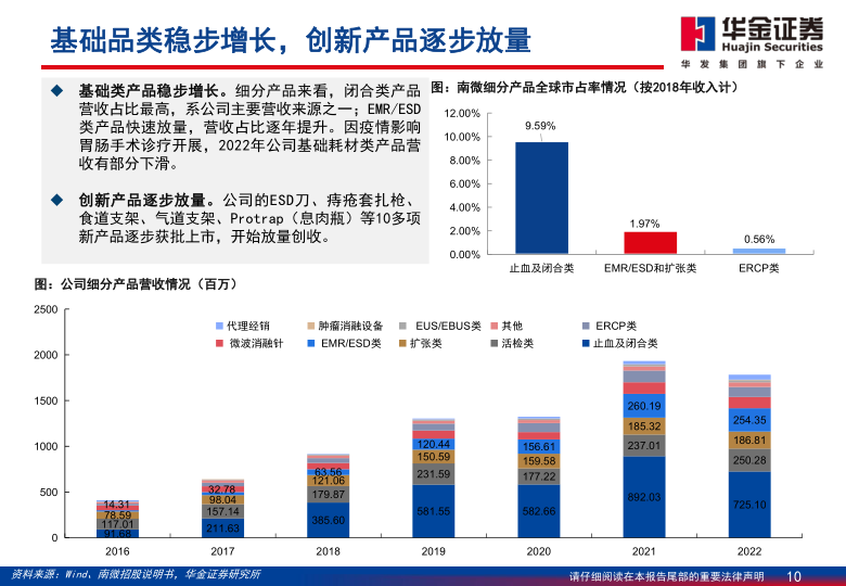 内镜诊疗器械品类齐全, 常规业务有望恢复快速增长。 公司的软组织夹凭借优异性能和性价比优势高速放量,2016-2021年营收CAGR约58%; 中高端重磅产品黄金刀自2019上市以来, 放量表现抢眼, ESD/EMR品类2016-2021年营收CAGR约46%, 保持高速增长; 同时布局高端ERCP类、 EUS/EBUS类器械, 打造内镜消化耗材全品类, 未来有望借助基础耗材渠道优势和品牌优势打开进院通道, 实现中高端器械快速放量。 同时聚焦临床需求, 加速推进创新产品更新迭代, 2022年牵拉夹、 三臂夹、 闭合夹、 合金夹等止血类产品相继获得国内注册, 为公司提供新的增长点。 2023年随着院内诊疗有序复苏, 公司常规业务有望恢复快速增长。