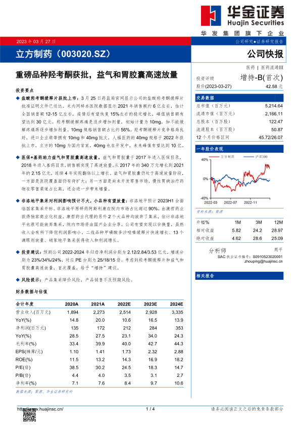 本报告分析了立方制药的业务发展情况,认为公司重磅品种羟考酮获批上市,益气和胃胶囊高速放量,非洛地平集采影响有限,小品种有望放量。预测公司未来三年净利润保持较快增长,首次覆盖给予“增持”建议,同时也提示了产品集采降价和销售不及预期的风险。