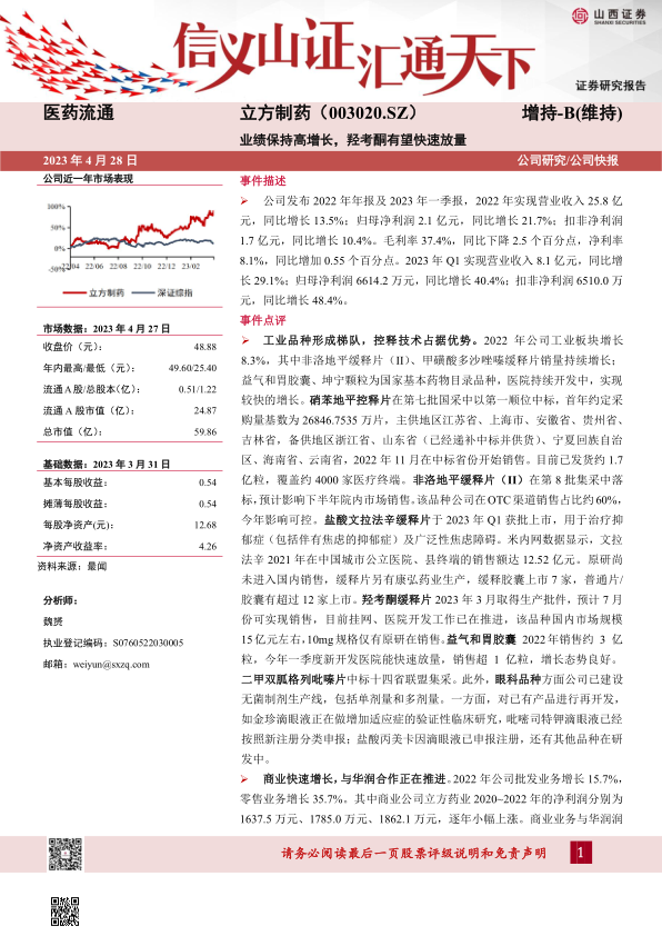 商业快速增长, 与华润合作正在推进。 2022 年公司批发业务增长 15.7%,零售业务增长 35.7%。 其中商业公司立方药业 2020~2022 年的净利润分别为1637.5 万元、 1785.0 万元、 1862.1 万元, 逐年小幅上涨。 商业业务与华润润曜的合作已经股东大会审议通过, 预计在今年上半年交割, 完成后有助于降低公司资产负债率, 优化资产结构, 聚焦工业业务发展。