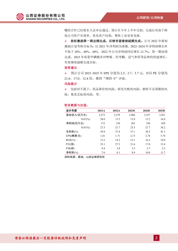 股权激励第一期业绩达成, 后续有望继续超额完成。 公司 2022 年股权激励计划考核目标为: 以 2021 年净利润为基数, 2022~2024 年净利润增长率不低于 20%、 40%、 60%。 2022 年公司净利润同比增长 21.7%, 第一期业绩达成。 2023 年依靠甲磺酸多沙唑嗪、 羟考酮、 益气和胃等品种的快速增长,有望继续超额完成目标。