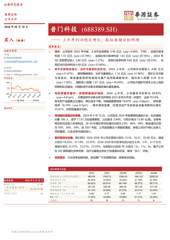本报告对普门科技(688389.SH)2024年中报进行了分析,并维持“买入”评级。核心观点如下: