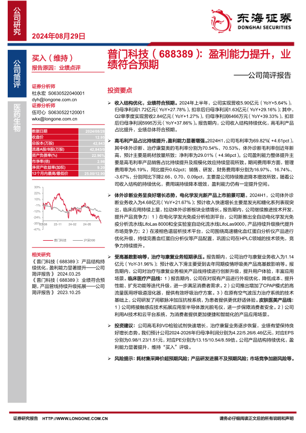 本报告对普门科技(688389)2024年上半年的业绩进行了简要分析,并维持“买入”评级。