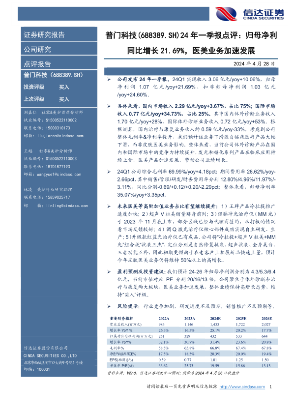 24年一季报点评:归母净利同比增长21.69%,医美业务加速发展