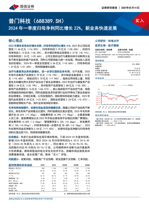 普门科技在2023年及2024年一季度表现出良好的增长势头,营收和利润均实现显著增长。公司在体外诊断和治疗康复两大领域协同发展,同时积极拓展国际市场和新业务。毛利率和净利率的提升,以及健康的现金流,都表明公司盈利能力不断增强。维持“买入”评级,但需关注政策风险、销售推广、研发进展和汇率风险等潜在风险。