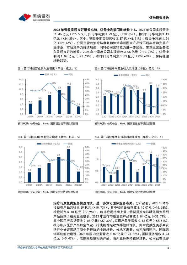 2023年营收呈现良好增长态势,归母净利润同比增长31%。2023年公司实现营收11.46亿元(+16.55%),归母净利润3.29亿元(+30.65%),扣非归母净利润3.13亿元(+34.39%)。其中第四季度实现营收3.37亿(+8.71%),归母净利润1.24亿(+25.66%),公司主营的治疗与康复和体外诊断两大业务不断丰富和完善产品体系,同时公司营销能力进一步加强,带动收入呈现良好的增长。2024年一季度实现营收3.06亿元(+10.06%),归母净利润1.07亿元(+21.69%),保持稳健增长趋势。